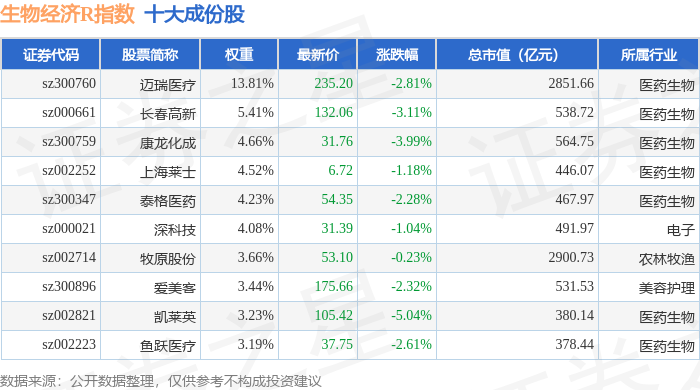 证券之星消息,10月13日,生物经济R(470038)指数报收于2607.46点,跌1.83%,成交314.96亿元,换手率2.07%。当日该指数成份股中,上涨的有6家,华测检测以2.51%的涨幅领涨,下跌的有44家,博腾股份以6.27%的跌幅领跌。