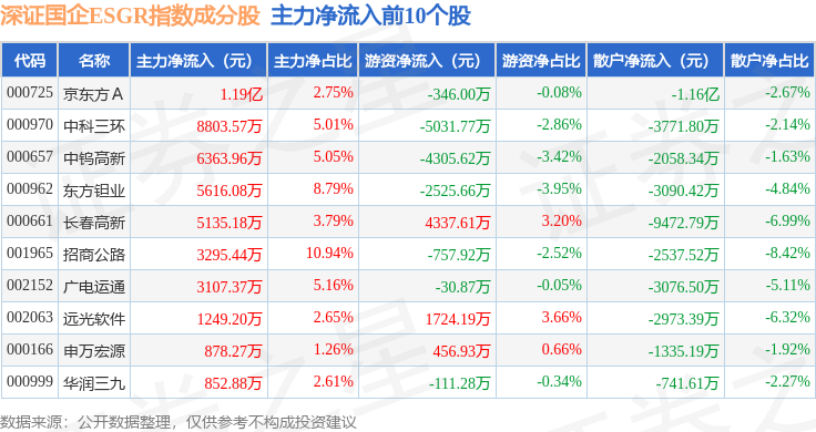 资金流向方面,深证国企ESGR(470055)指数成份股当日主力资金净流出合计8.63亿元,游资资金净流出合计5846.41万元,散户资金净流入合计9.21亿元。成份股资金流向详情见下表: