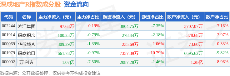资金流向方面,深成地产R(471001)指数成份股当日主力资金净流出合计1.17亿元,游资资金净流入合计1422.6万元,散户资金净流入合计1.02亿元。成份股资金流向详情见下表: