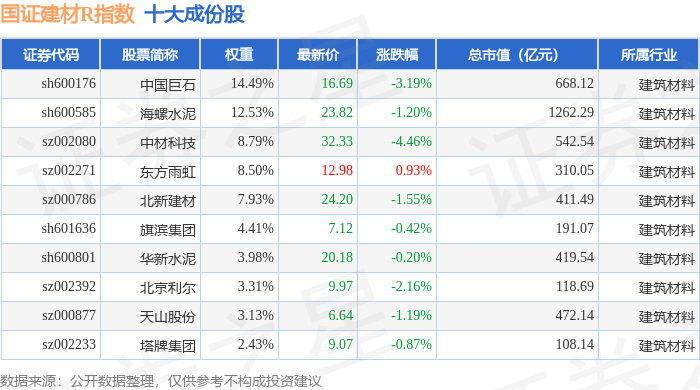 证券之星消息,10月13日,国证建材R(480048)指数报收于7019.45点,跌1.63%,成交99.72亿元,换手率2.0%。当日该指数成份股中,上涨的有4家,宁波富达以2.33%的涨幅领涨,下跌的有26家,中材科技以4.46%的跌幅领跌。