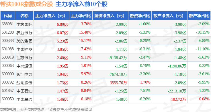资金流向方面,帮扶100R(480065)指数成份股当日主力资金净流出合计74.4亿元,游资资金净流入合计17.81亿元,散户资金净流入合计56.59亿元。成份股资金流向详情见下表: