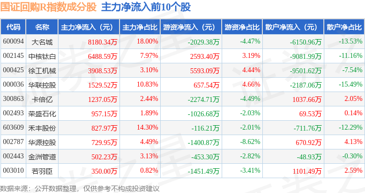 资金流向方面,国证回购R(480063)指数成份股当日主力资金净流出合计2.02亿元,游资资金净流入合计1.05亿元,散户资金净流入合计9667.11万元。成份股资金流向详情见下表: