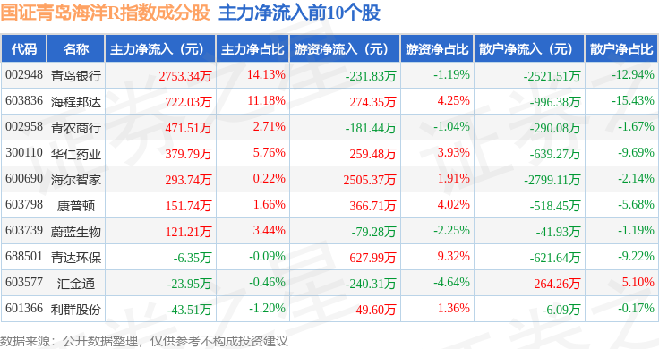 资金流向方面,国证青岛海洋R(480532)指数成份股当日主力资金净流出合计2.02亿元,游资资金净流入合计5938.76万元,散户资金净流入合计1.42亿元。成份股资金流向详情见下表: