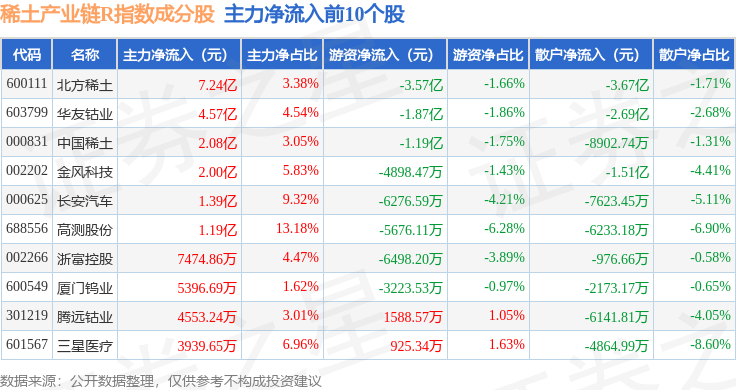 资金流向方面,稀土产业链R(489013)指数成份股当日主力资金净流出合计21.31亿元,游资资金净流入合计2.51亿元,散户资金净流入合计18.79亿元。成份股资金流向详情见下表: