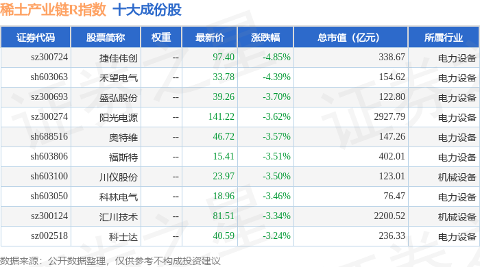 证券之星消息,10月13日,稀土产业链R(489013)指数报收于4067.03点,涨0.52%,成交1390.06亿元,换手率3.73%。当日该指数成份股中,上涨的有25家,中国稀土以10.01%的涨幅领涨,下跌的有25家,捷佳伟创以4.85%的跌幅领跌。