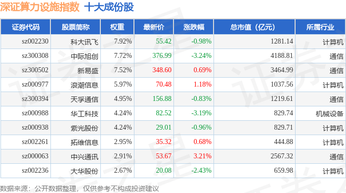 证券之星消息,10月13日,深证算力设施(970051)指数报收于11363.94点,跌0.37%,成交1261.19亿元,换手率4.82%。当日该指数成份股中,上涨的有18家,全志科技以7.45%的涨幅领涨,下跌的有32家,神州数码以7.32%的跌幅领跌。