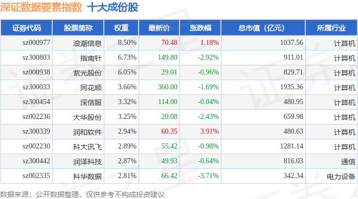 证券之星消息,10月13日,深证数据要素(970053)指数报收于4118.94点,跌0.54%,成交593.63亿元,换手率3.31%。当日该指数成份股中,上涨的有18家,视觉中国以7.41%的涨幅领涨,下跌的有32家,华测导航以5.93%的跌幅领跌。