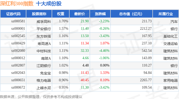 证券之星消息,10月13日,深红利300(970062)指数报收于5531.31点,跌1.09%,成交2422.28亿元,换手率2.4%。当日该指数成份股中,上涨的有66家,奥瑞金以10.02%的涨幅领涨,下跌的有232家,浩洋股份以7.94%的跌幅领跌。