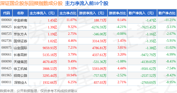 资金流向方面,深证国企股东回报(970064)指数成份股当日主力资金净流出合计1.77亿元,游资资金净流入合计4.47亿元,散户资金净流出合计2.69亿元。成份股资金流向详情见下表: