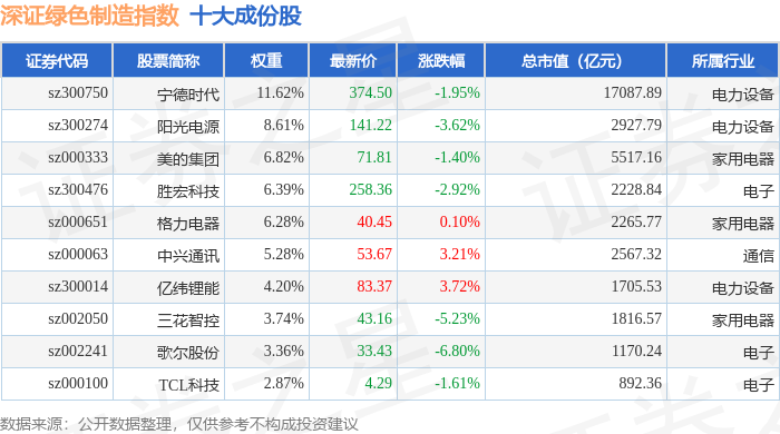 证券之星消息,10月13日,深证绿色制造(970069)指数报收于1870.9点,跌1.07%,成交1492.96亿元,换手率3.09%。当日该指数成份股中,上涨的有14家,多氟多以9.98%的涨幅领涨,下跌的有36家,歌尔股份以6.8%的跌幅领跌。