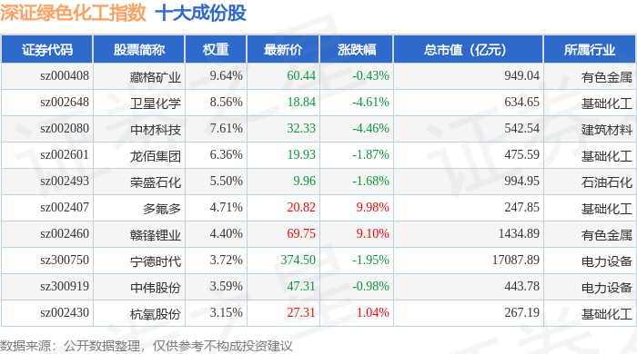证券之星消息,10月13日,深证绿色化工(970076)指数报收于1609.61点,跌0.57%,成交544.81亿元,换手率2.48%。当日该指数成份股中,上涨的有14家,多氟多以9.98%的涨幅领涨,下跌的有36家,华峰化学以4.97%的跌幅领跌。