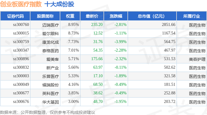 证券之星消息,10月13日,创业板医疗(970082)指数报收于3899.12点,跌1.74%,成交132.79亿元,换手率1.7%。当日该指数成份股中,上涨的有5家,麦克奥迪以1.93%的涨幅领涨,下跌的有45家,博腾股份以6.27%的跌幅领跌。