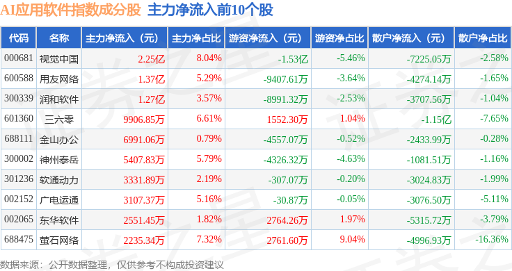 资金流向方面,AI应用软件(980107)指数成份股当日主力资金净流出合计14.76亿元,游资资金净流入合计3.38亿元,散户资金净流入合计11.39亿元。成份股资金流向详情见下表: