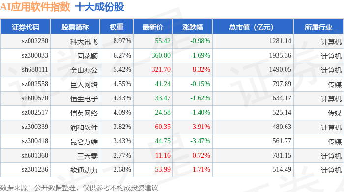 证券之星消息,10月13日,AI应用软件(980107)指数报收于1669.59点,跌0.31%,成交616.14亿元,换手率3.33%。当日该指数成份股中,上涨的有14家,金山办公以8.32%的涨幅领涨,下跌的有35家,奥比中光以5.12%的跌幅领跌。