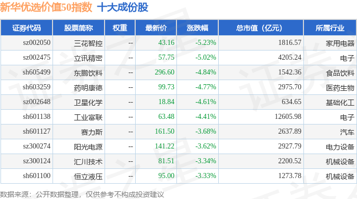证券之星消息,10月13日,新华优选价值50(989004)指数报收于2167.56点,跌1.79%,成交2412.8亿元,换手率1.54%。当日该指数成份股中,上涨的有8家,洛阳钼业以3.11%的涨幅领涨,下跌的有42家,三花智控以5.23%的跌幅领跌。