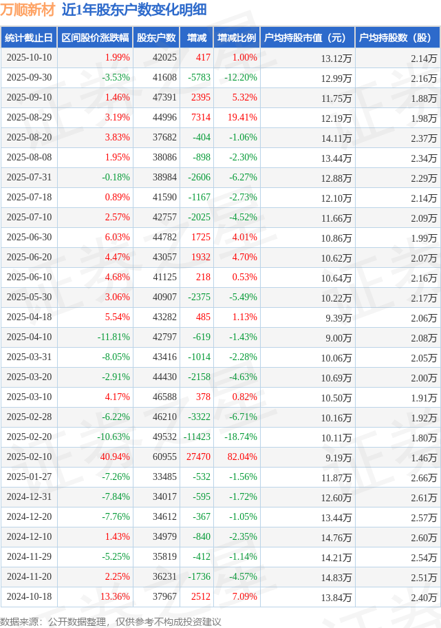 从股价来看,2025年9月30日至2025年10月10日,万顺新材区间涨幅为1.99%,在此期间股东户数增加417.0户,增幅为1.0%。