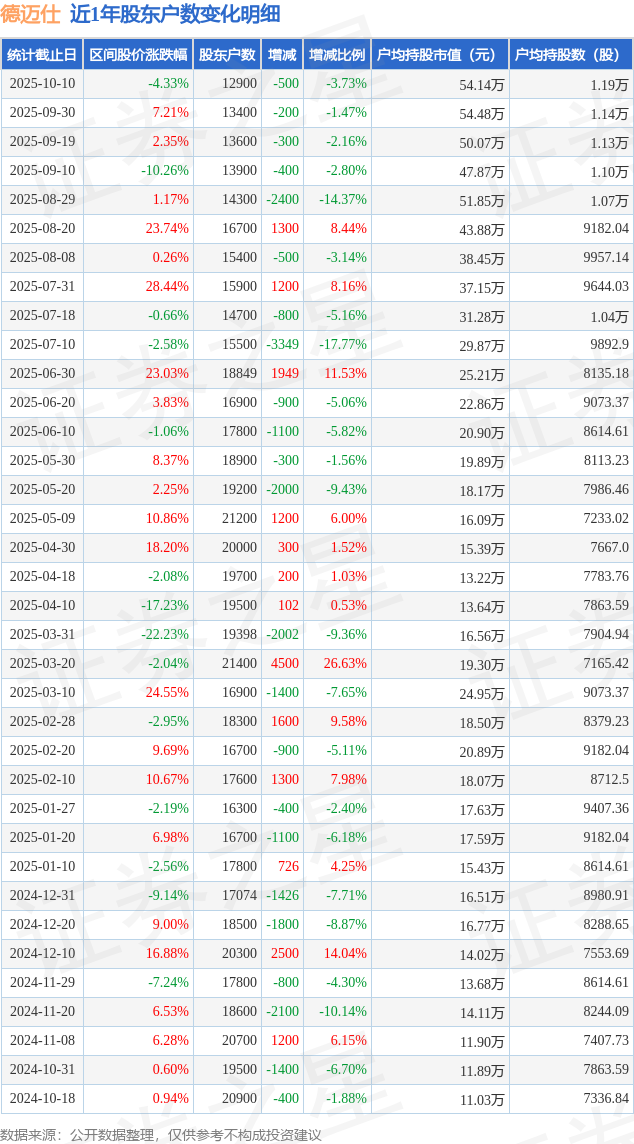 从股价来看,2025年9月30日至2025年10月10日,德迈仕区间跌幅为4.33%,在此期间股东户数减少500.0户,减幅为3.73%。