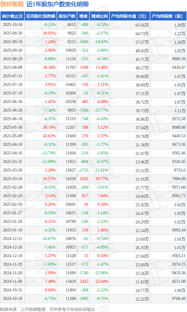 从股价来看,2025年9月30日至2025年10月10日,信邦智能区间跌幅为6.25%,在此期间股东户数减少408.0户,减幅为4.52%。