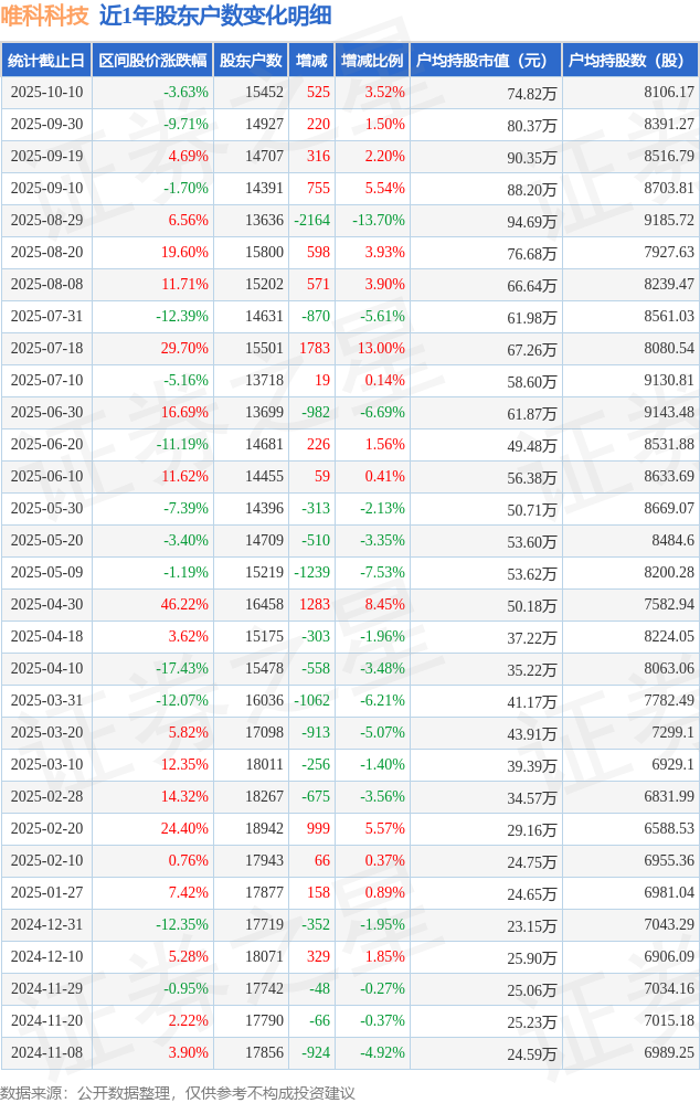 从股价来看,2025年9月30日至2025年10月10日,唯科科技区间跌幅为3.63%,在此期间股东户数增加525.0户,增幅为3.52%。