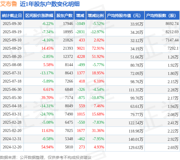 从股价来看,2025年9月19日至2025年9月30日,艾布鲁区间跌幅为6.22%,在此期间股东户数减少1049.0户,减幅为5.52%。