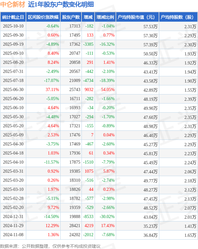 从股价来看,2025年9月30日至2025年10月10日,中仑新材区间跌幅为0.64%,在此期间股东户数减少182.0户,减幅为1.04%。