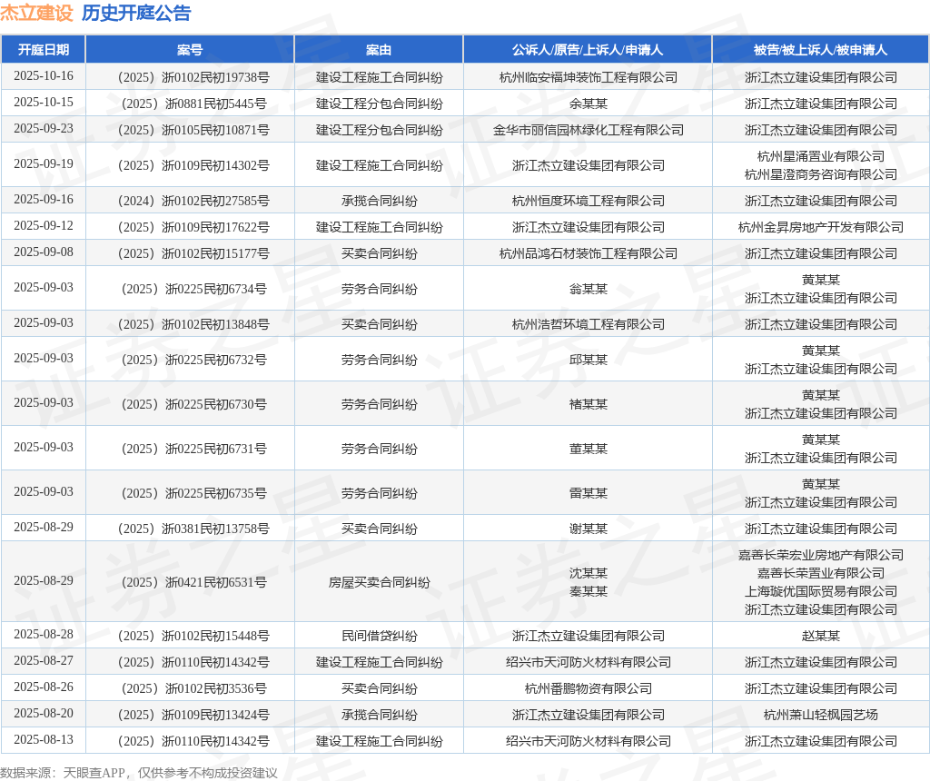 案号:(2025)浙0102民初19738号根据统计,近一年内以浙江杰立建设集团有限公司为当事人的历史开庭公告有65则,其中案由为“建设工程施工合同纠纷”的公告以14则居首,其次为“买卖合同纠纷”有12则,“劳务合同纠纷”有6则。历史开庭公告(前20条)如下: