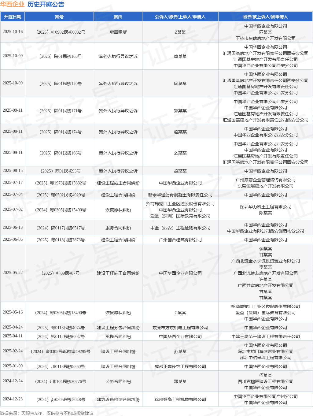 案号:(2025)桂0902民初6082号根据统计,近一年内以中国华西企业有限公司为当事人的历史开庭公告有30则,其中案由为“建设工程合同纠纷”的公告以6则居首,其次为“案外人执行异议之诉”有6则,“建设工程施工合同纠纷”有5则。历史开庭公告(前20条)如下: