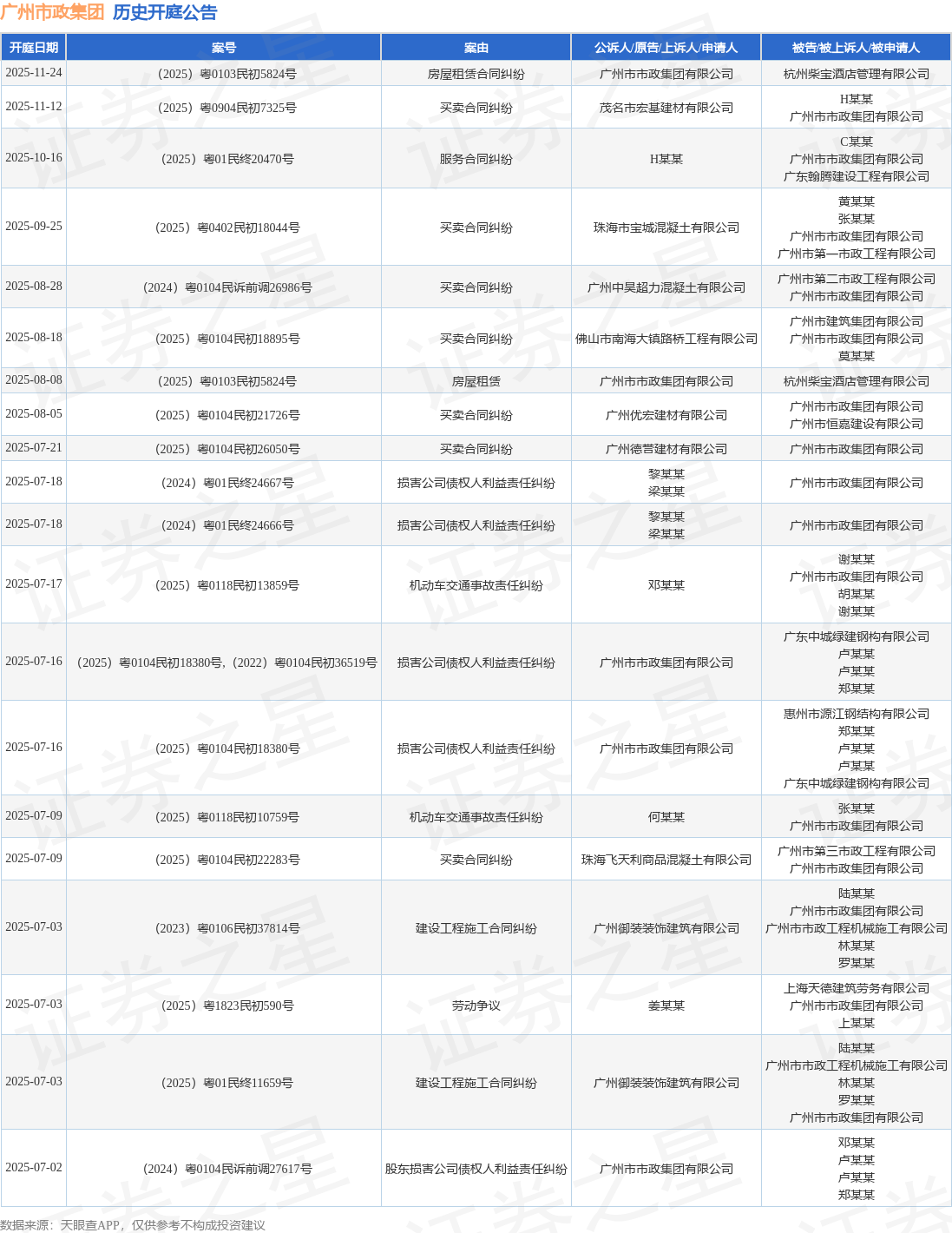 案号:(2025)粤01民终20470号根据统计,近一年内以广州市市政集团有限公司为当事人的历史开庭公告有125则,其中案由为“买卖合同纠纷”的公告以58则居首,其次为“损害公司债权人利益责任纠纷”有16则,“建设工程施工合同纠纷”有8则。历史开庭公告(前20条)如下:
