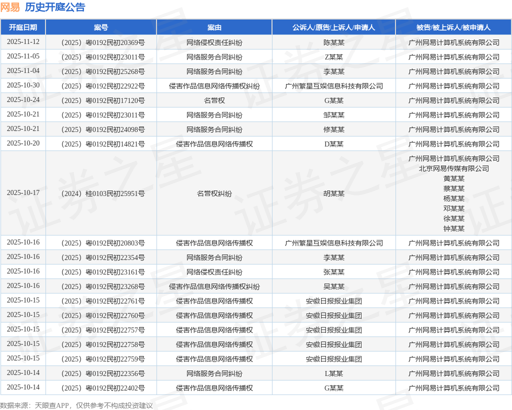 案号:(2025)粤0192民初23161号根据统计,近一年内以广州网易计算机系统有限公司为当事人的历史开庭公告有389则,其中案由为“网络服务合同纠纷”的公告以130则居首,其次为“侵害作品信息网络传播权纠纷”有130则,“网络侵权责任纠纷”有55则。历史开庭公告(前20条)如下: