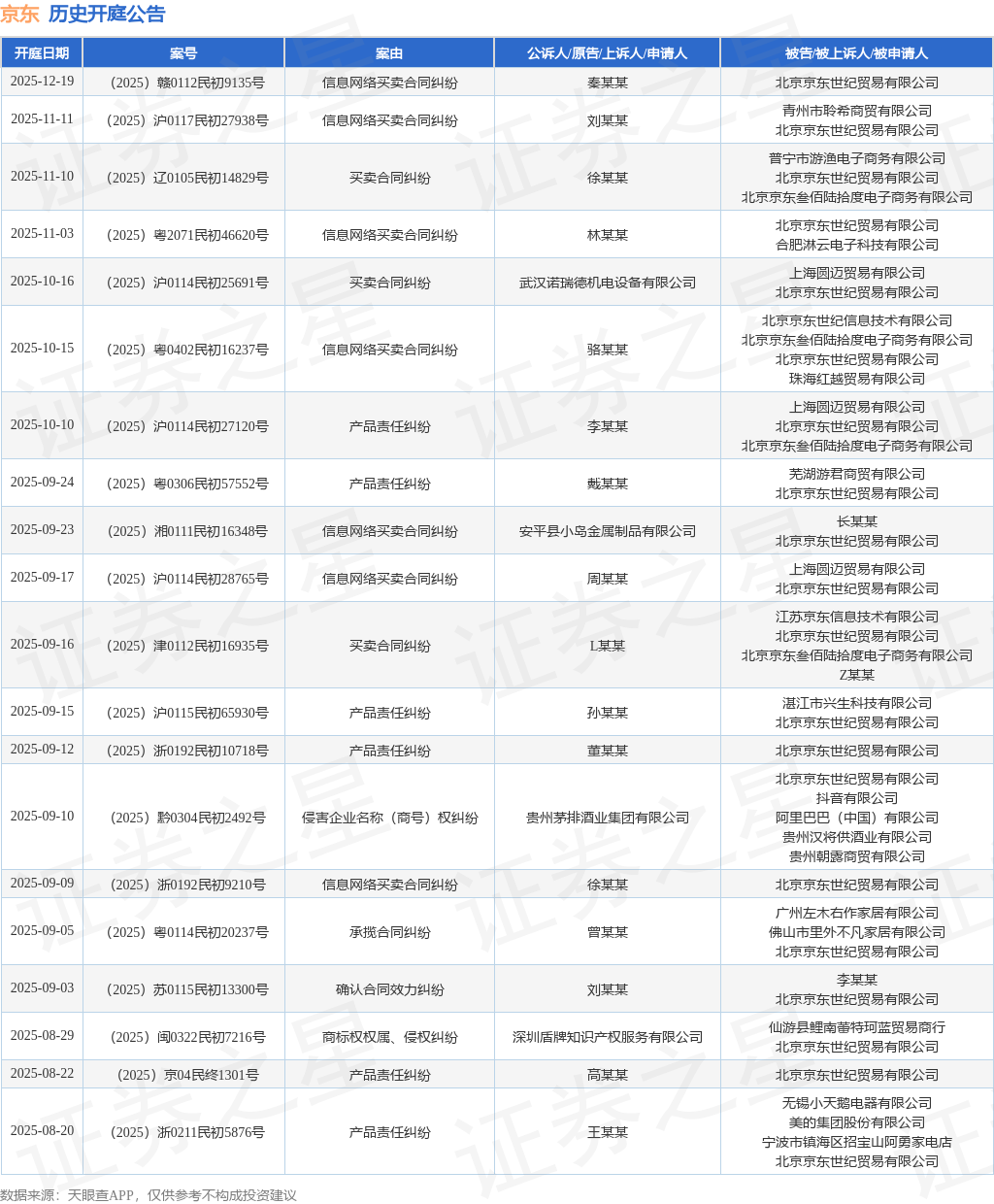 案号:(2025)沪0114民初25691号根据统计,近一年内以北京京东世纪贸易有限公司为当事人的历史开庭公告有188则,其中案由为“信息网络买卖合同纠纷”的公告以56则居首,其次为“买卖合同纠纷”有32则,“产品责任纠纷”有24则。历史开庭公告(前20条)如下:
