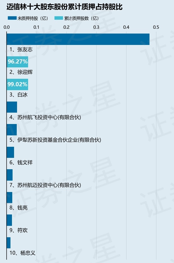 截止本公告日,股东徐迎辉已累计质押股份700.0万股,占其持股总数的96.27%,股东白冰已累计质押股份720.0万股,占其持股总数的99.02%。本次质押后迈信林十大股东的累计质押股份占持股比例(占持股比例的计算以公司最新一期财务报表公布的十大股东的持股总数为基准)见下图: