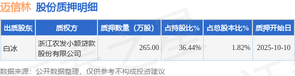 证券之星消息,迈信林(688685)10月14日公开信息显示,股东白冰向浙江农发小额贷款股份有限公司合计质押265.0万股,占总股本1.82%。质押详情见下表: