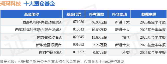 根据2025基金半年报公募基金重仓股数据,重仓该股的公募基金共5家,其中持有数量最多的公募基金为西部利得基金的西部利得事件驱动股票A。西部利得事件驱动股票A目前规模为4.75亿元,最新净值3.8988(10月13日),较上一交易日上涨0.08%,近一年上涨98.85%。该公募基金现任基金经理为张昌平。张昌平在任的基金产品包括:西部利得时代动力混合发起A,管理时间为2022年5月31日至今,期间收益率为58.34%;西部利得新富混合A,管理时间为2025年8月15日至今,期间收益率为2.54%;西部利得CES芯片指数增强A,管理时间为2025年9月6日至今,期间收益率为17.49%。