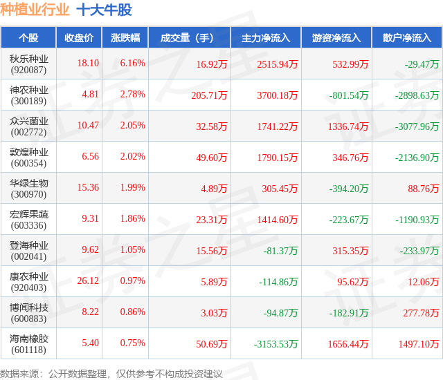 个股表现方面,种植业行业当日领涨股为秋乐种业(920087),该股当日报收18.1,上涨6.16%,成交量16.92万,主力资金净流入2515.94万元。神农种业(300189)以上涨2.78%紧随其后,该股当日成交量205.71万,主力资金净流入3700.18万元。除此之外,众兴菌业(002772)、敦煌种业(600354)、华绿生物(300970)均进入当日牛股之列。具体个股列表见下表: