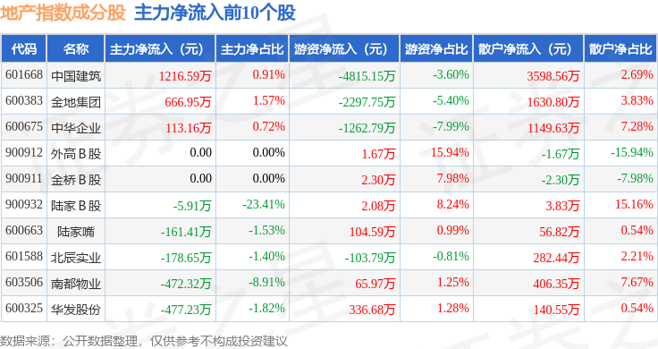 资金流向方面,地产指数(000006)成份股当日主力资金净流出合计3.41亿元,游资资金净流出合计8089.22万元,散户资金净流入合计4.22亿元。成份股资金流向详情见下表: