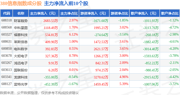 资金流向方面,380信息(000111)指数成份股当日主力资金净流出合计39.5亿元,游资资金净流入合计17.25亿元,散户资金净流入合计22.25亿元。成份股资金流向详情见下表: