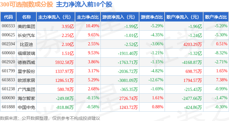 资金流向方面,300可选(000911)指数成份股当日主力资金净流出合计12.74亿元,游资资金净流出合计2.37亿元,散户资金净流入合计15.11亿元。成份股资金流向详情见下表:
