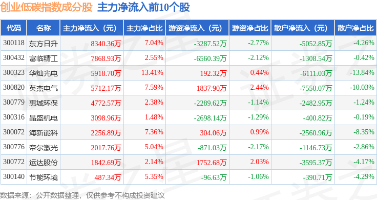 资金流向方面,创业低碳(399259)指数成份股当日主力资金净流出合计56.02亿元,游资资金净流入合计17.07亿元,散户资金净流入合计38.95亿元。成份股资金流向详情见下表: