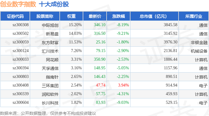 证券之星消息,10月14日,创业数字(399263)指数报收于2883.17点,跌4.79%,成交1408.39亿元,换手率4.09%。当日该指数成份股中,上涨的有2家,三环集团以3.94%的涨幅领涨,下跌的有48家,新易盛以9.21%的跌幅领跌。