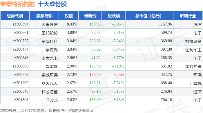 专精特新(399267)指数十大成份股详情如下: