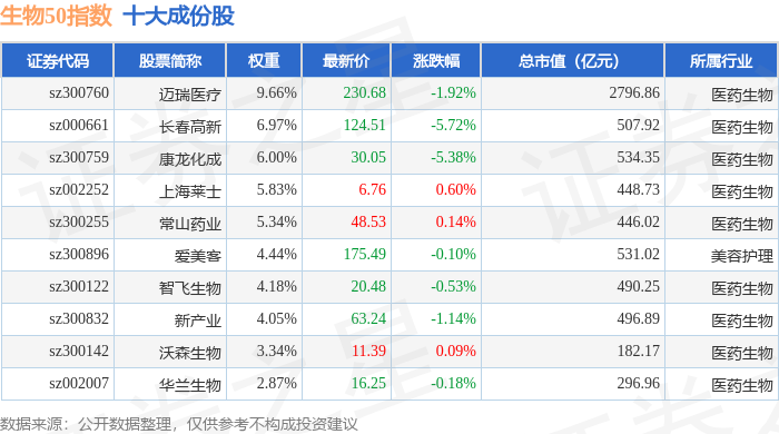 证券之星消息,10月14日,生物50(399280)指数报收于2173.23点,跌1.33%,成交164.37亿元,换手率1.74%。当日该指数成份股中,上涨的有12家,我武生物以4.79%的涨幅领涨,下跌的有36家,宏源药业以6.33%的跌幅领跌。