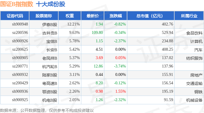 证券之星消息,10月14日,国证B指(399318)指数报收于5351.84点,跌0.67%,成交3.3亿元,换手率0.27%。当日该指数成份股中,上涨的有21家,耀皮B股以4.51%的涨幅领涨,下跌的有45家,杭汽轮B以3.74%的跌幅领跌。