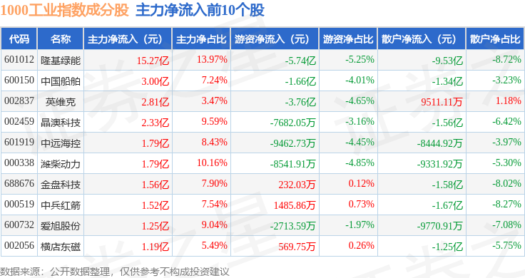 资金流向方面,1000工业(399383)指数成份股当日主力资金净流出合计83.75亿元,游资资金净流入合计16.04亿元,散户资金净流入合计67.71亿元。成份股资金流向详情见下表: