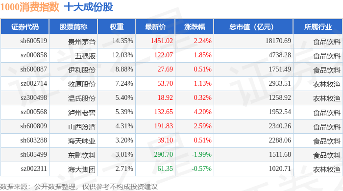 证券之星消息,10月14日,1000消费(399385)指数报收于9990.74点,涨1.28%,成交419.31亿元,换手率1.3%。当日该指数成份股中,上涨的有43家,酒鬼酒以6.68%的涨幅领涨,下跌的有13家,乖宝宠物以3.17%的跌幅领跌。