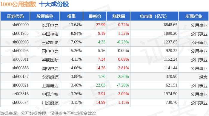 证券之星消息,10月14日,1000公用(399390)指数报收于2693.77点,涨0.19%,成交283.86亿元,换手率1.29%。当日该指数成份股中,上涨的有32家,国投电力以2.81%的涨幅领涨,下跌的有11家,上海电力以7.2%的跌幅领跌。