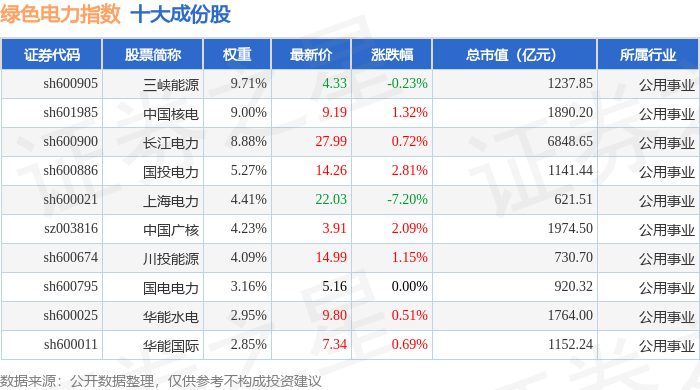 证券之星消息,10月14日,绿色电力(399438)指数报收于2096.3点,涨0.09%,成交291.7亿元,换手率1.24%。当日该指数成份股中,上涨的有32家,京运通以6.01%的涨幅领涨,下跌的有13家,上海电力以7.2%的跌幅领跌。