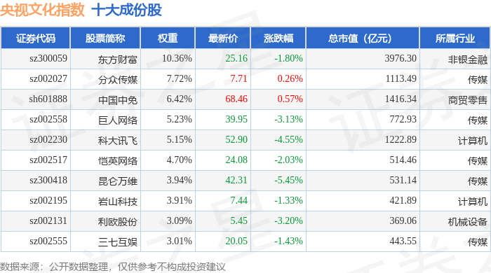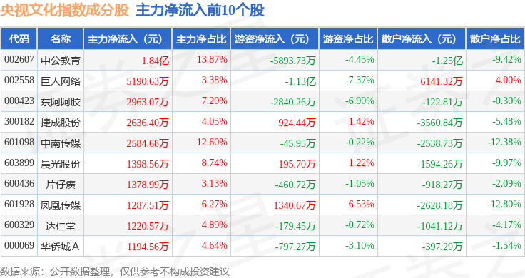 资金流向方面,央视文化(399557)指数成份股当日主力资金净流出合计34.97亿元,游资资金净流入合计10.4亿元,散户资金净流入合计24.57亿元。成份股资金流向详情见下表: