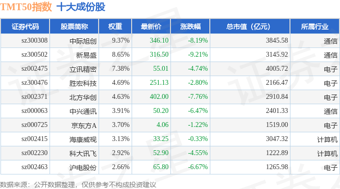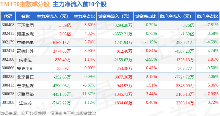 资金流向方面,TMT50(399610)指数成份股当日主力资金净流出合计162.29亿元,游资资金净流入合计54.47亿元,散户资金净流入合计107.82亿元。成份股资金流向详情见下表: