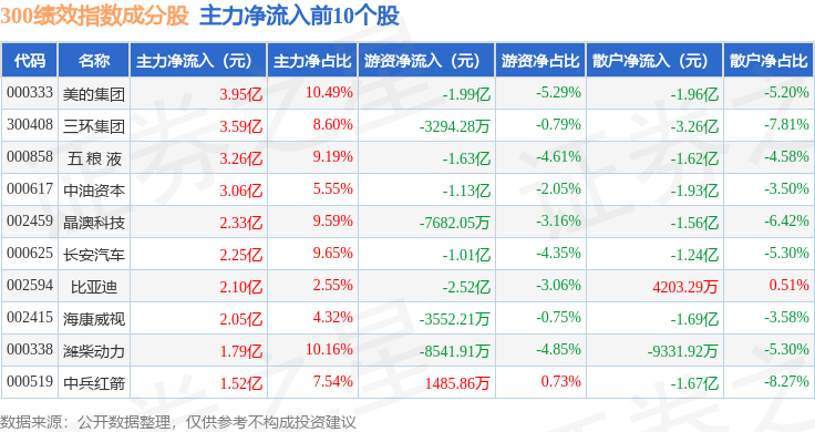 资金流向方面,300绩效(399657)指数成份股当日主力资金净流出合计343.3亿元,游资资金净流入合计96.54亿元,散户资金净流入合计246.76亿元。成份股资金流向详情见下表: