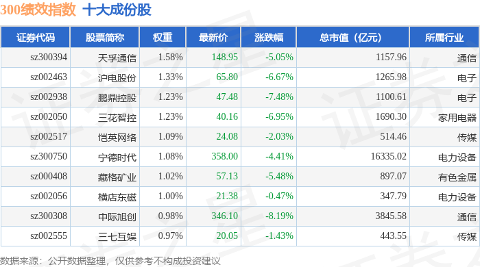 证券之星消息,10月14日,300绩效(399657)指数报收于6889.13点,跌2.25%,成交5902.02亿元,换手率2.33%。当日该指数成份股中,上涨的有81家,中油资本以7.07%的涨幅领涨,下跌的有214家,贝达药业以10.63%的跌幅领跌。